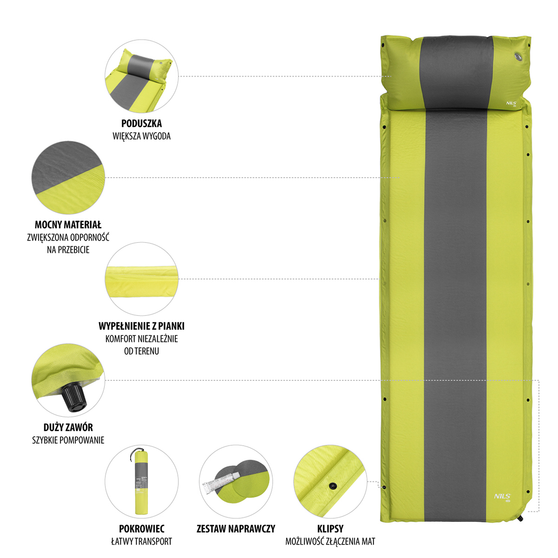 Najważniejsze cechy produktu NC4349 ZIELONO-SZARA MATA SAMOPOMPUJĄCA Z PODUSZKĄ NILS CAMP
