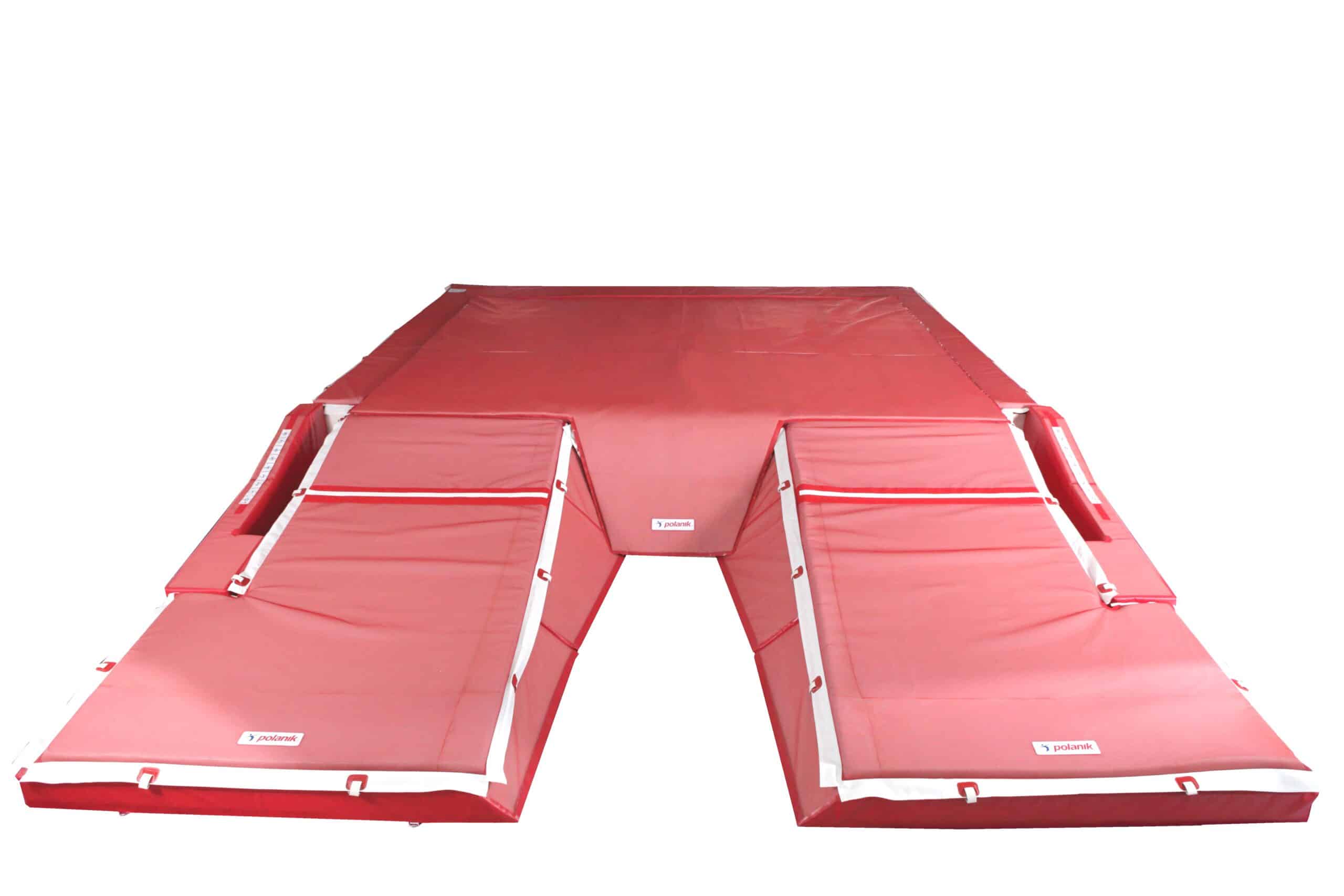 Zabezpieczająca nakładka antylkolcowa duża. Wymiary 5,4 m x 5,1 m. Przeznaczone do dodatkowej ochrony zeskoków przed nadmiernym zużyciem materaca w strefie lądowania. Ich zastosowanie podczas intensywnych treningów wydłuża żywotność zeskoku. Prosty i łatwy montaż na rzepy lub elastyczne linki.